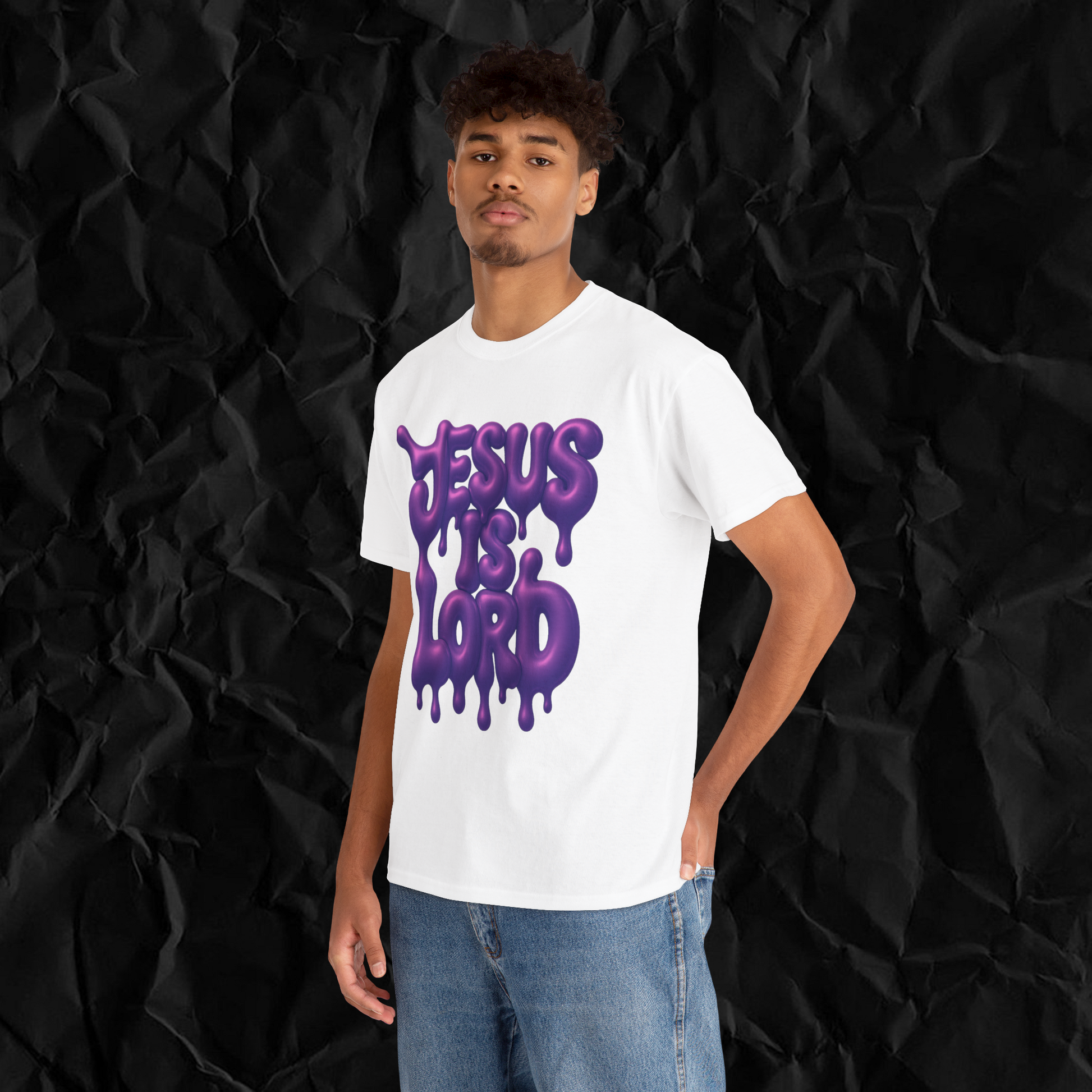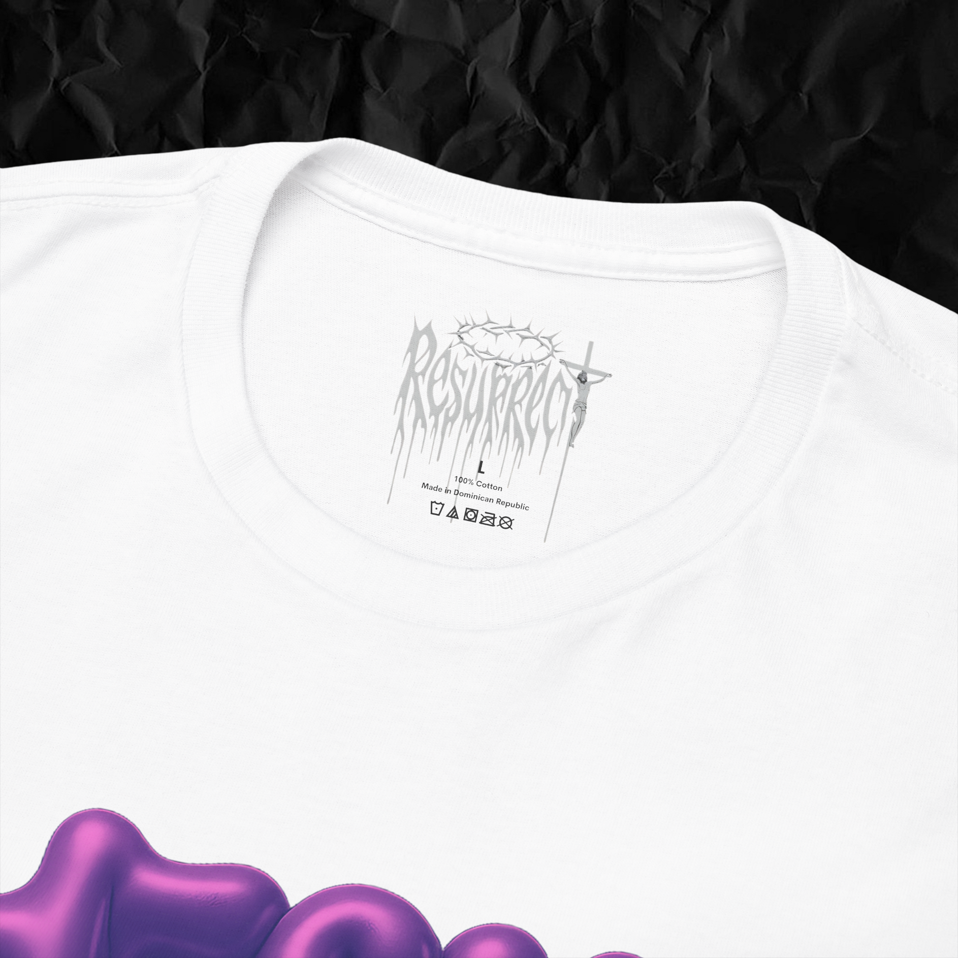 Loud faith, clean fit. The RESURRECT™ tee features glossy purple 3D drip bubble letters that read “JESUS IS LORD.”