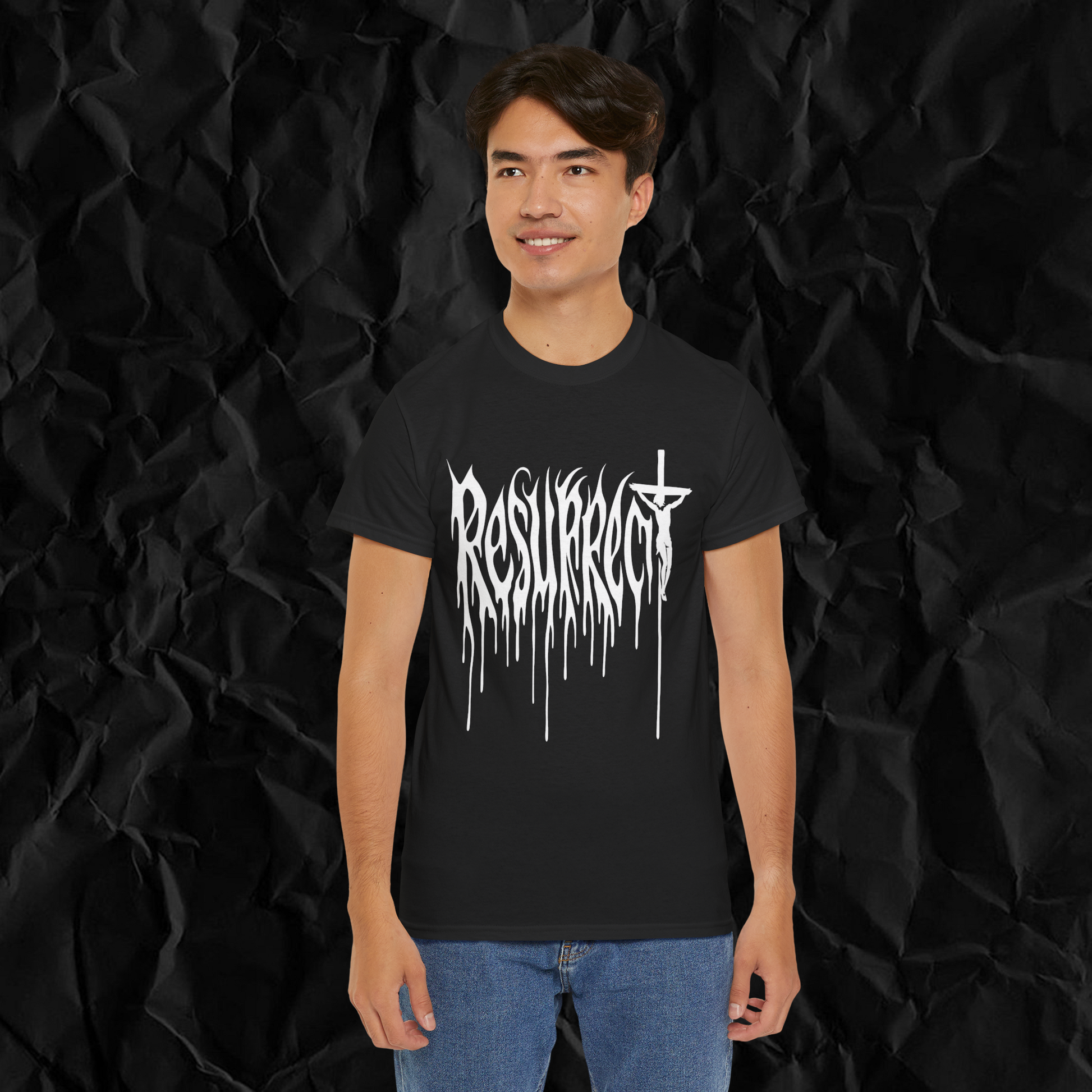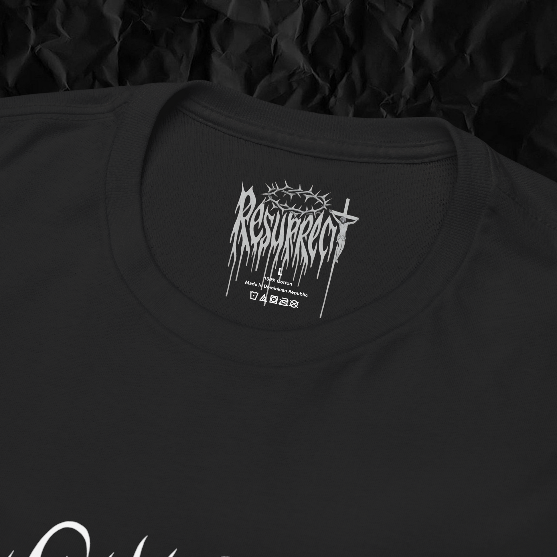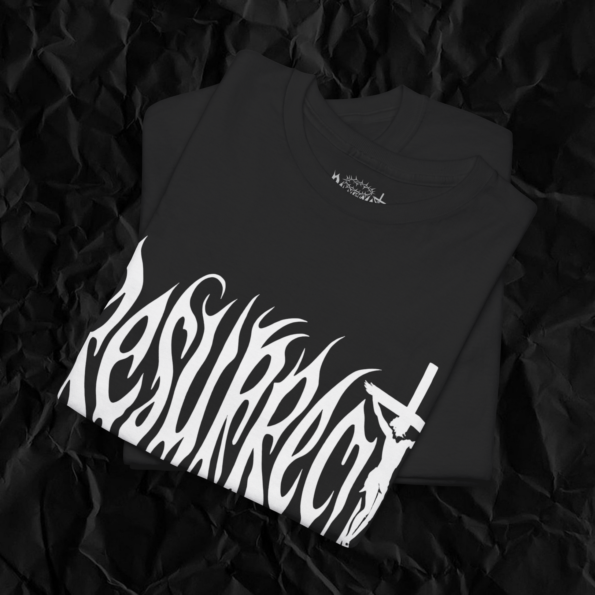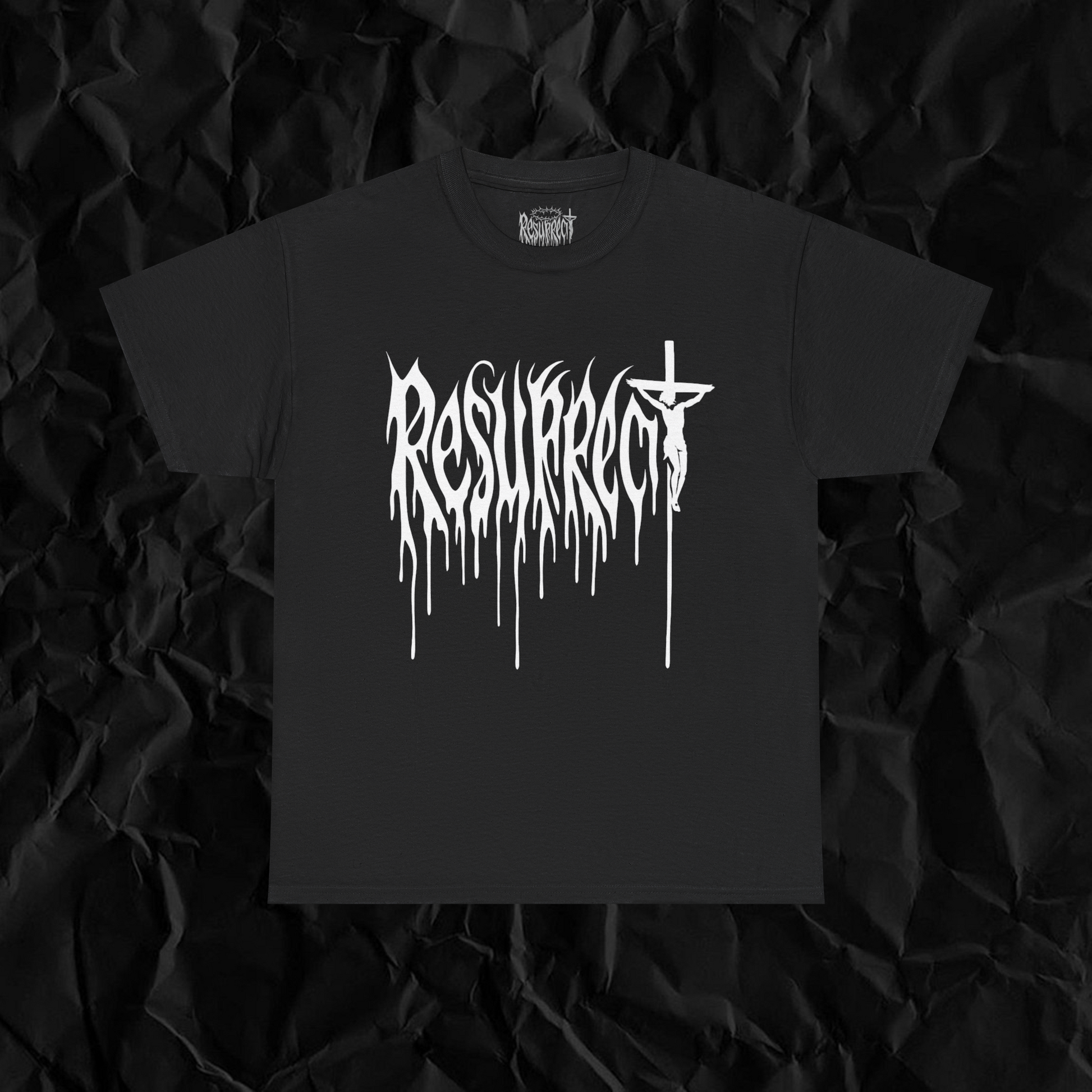 Make a statement. The RESURRECT™ drip logo meets a stark crucifix for a clean, monochrome graphic—equal parts Christian streetwear, gothic, and grunge.